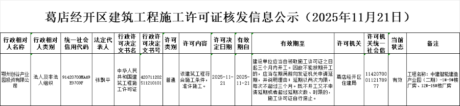 葛店经开区建筑工程施工许可证核发信息公示(2025年11月21日)