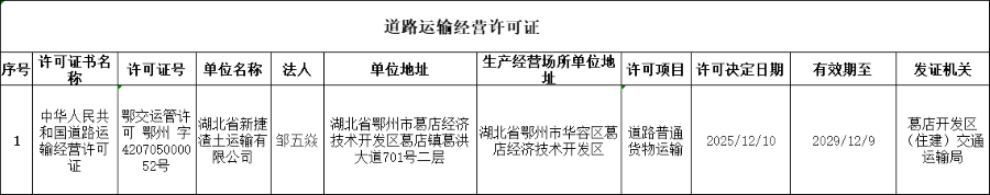 道路运输经营许可官网公示登记表(2025年12月10日)