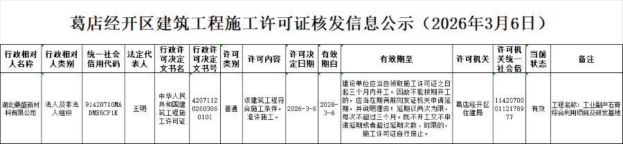 葛店经开区建筑工程施工许可证核发信息公示(2026年3月6日)