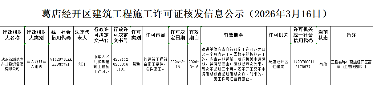 葛店经开区建筑工程施工许可证核发信息公示(2026年3月16日)