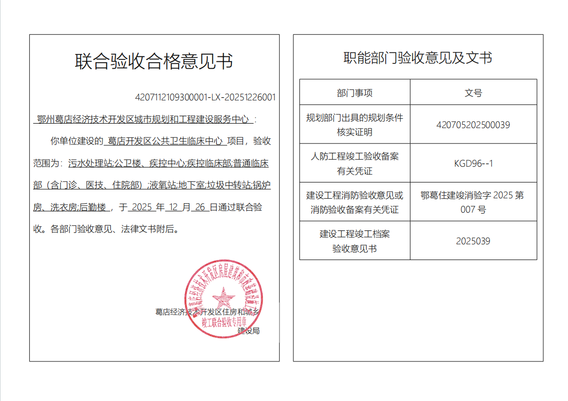 葛店开发区公共卫生临床中心项目联合验收合格意见书