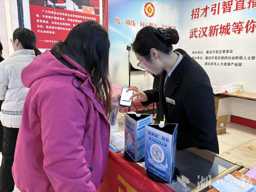 政企人才双向赋能,激活发展“新动能”。活动聚焦营商环境优化与人才发展需求,将政务服务深度嵌入企业发展全链条。一方面,通过跨区域协作机制,为葛店制造业企业精准输送团风富余劳动力,简化异地人才社保医保衔接、档案流转流程,让劳动力“引得进、留得住”;另一方面,针对大学生创业、高层次人才就业推出专项政务支持,现场设置创业政策咨询台,解读创业补贴申领、税收减免、场地扶持等政策,为创业项目提供行政审批绿色通道、资质办理全程代办服务。华烁科技、申通快递等参会企业纷纷表示,政务服务不仅解决了用工难题,人才落户、创业扶持等配套政策更让企业在引才留才上更具优势,为发展减负增效。