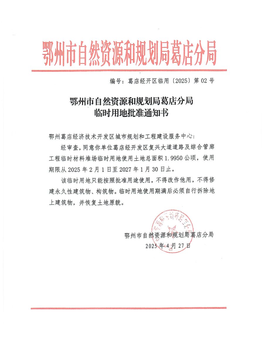 鄂州市自然资源和规划局葛店分局临时用地批准通知书 葛店经开区临用〔2025〕第02号
