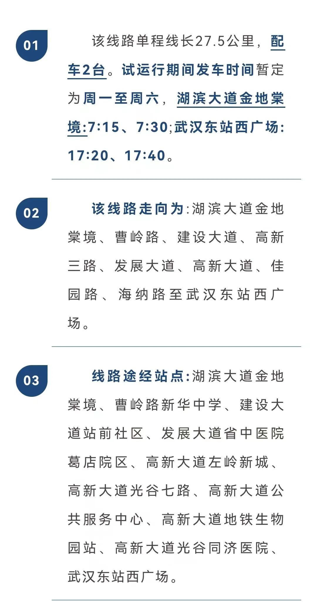 11月17日,葛店经开区传来好消息,为推动武汉新城建设,加快区域之间的交通路网联系,提升武鄂两地、特别是光谷与葛店之间的通勤小路,满足葛店南片居民的出行需求,葛店经开区住建局将开通301公交快线作为解决群众“急难愁盼”的重点难题予以专题推进,多次派工作组积极与武汉公交集团第五运营公司进行沟通协商,双方一致达成意见:从11月17日起,将试行湖滨大道金地棠境至武汉东站西广场的公交301路区间快线。