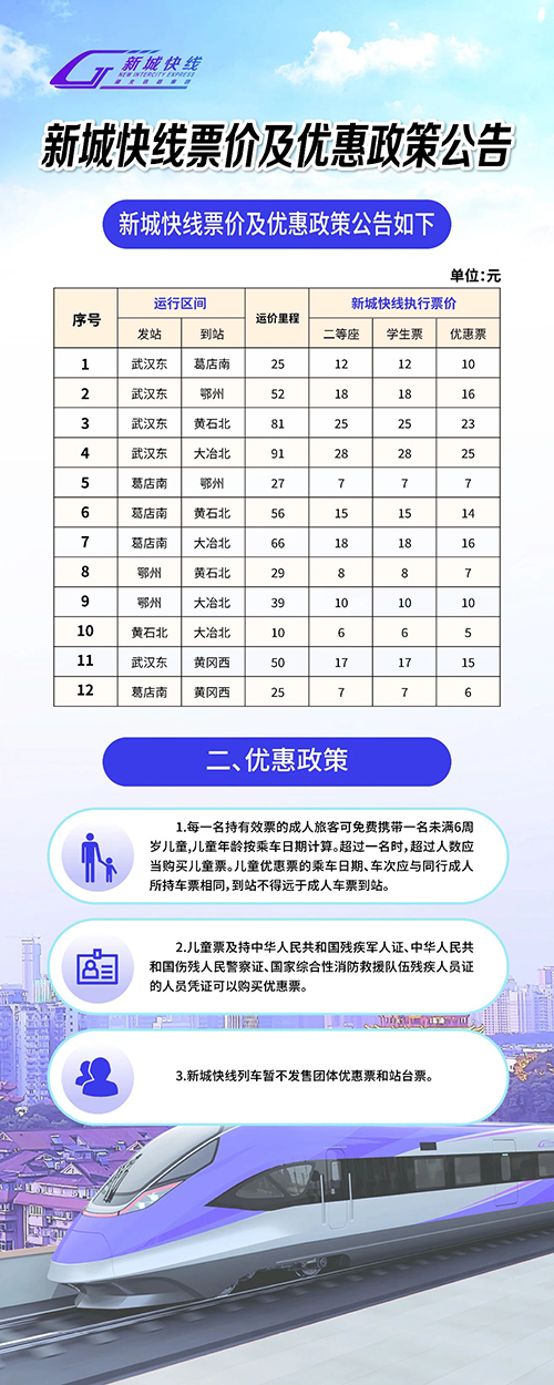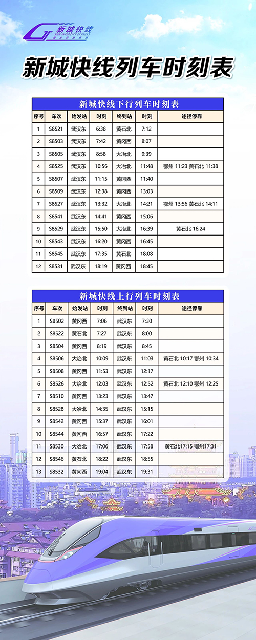 “新城快线”列车以武汉至黄石、武汉至黄冈两条城际铁路“公交化”运营为载体,目前设大冶北站、黄石北站、黄冈西站、鄂州站、武汉东站等办理站。