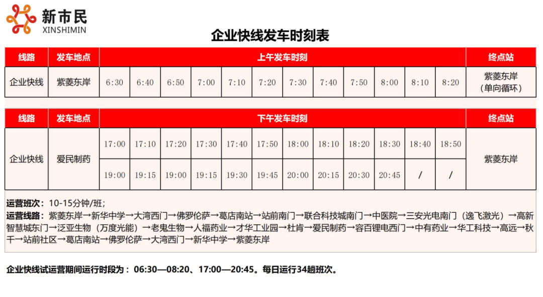 此外,于4月1日开通的第一条企业快线公交对运营班次也进行了优化。全程共8公里,共设站点27个,配置公交车4台,班次运行时间间隔10至15分钟,试运营期间运营时段为:06:30—08:20,17:00—20:45,每天有34趟车次。