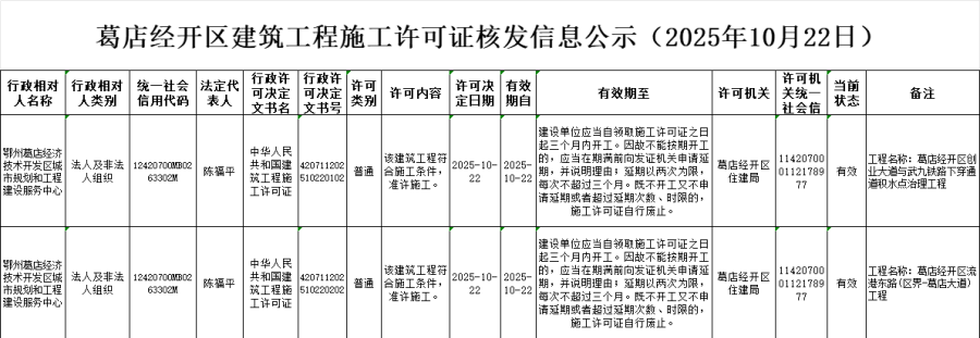 葛店经开区建筑工程施工许可证核发信息公示(2025年10月22日)