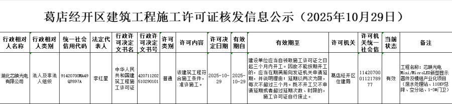 葛店经开区建筑工程施工许可证核发信息公示(2025年10月29日)