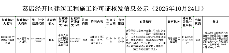 葛店经开区建筑工程施工许可证核发信息公示(2025年10月24日)