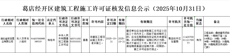 葛店经开区建筑工程施工许可证核发信息公示(2025年10月31日)