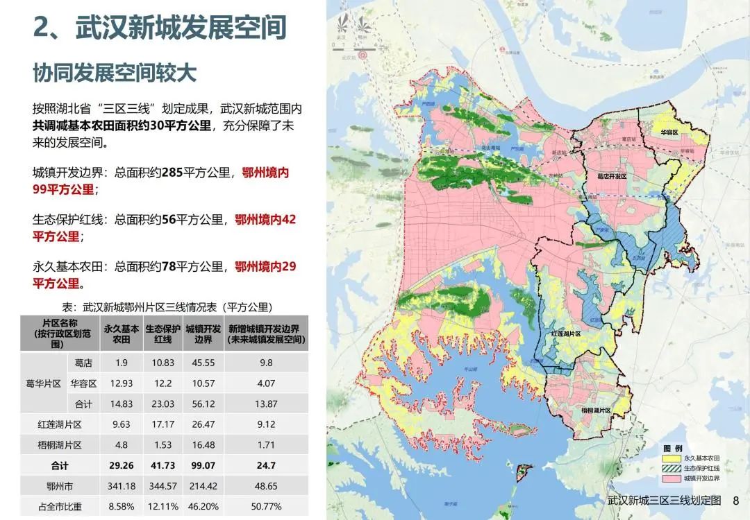 武汉新城可利用地面积117平方公里(鄂州片53平方公里),主要分布于未来城片区和葛店开发区(31.81平方公里),未来发展空间有保障。