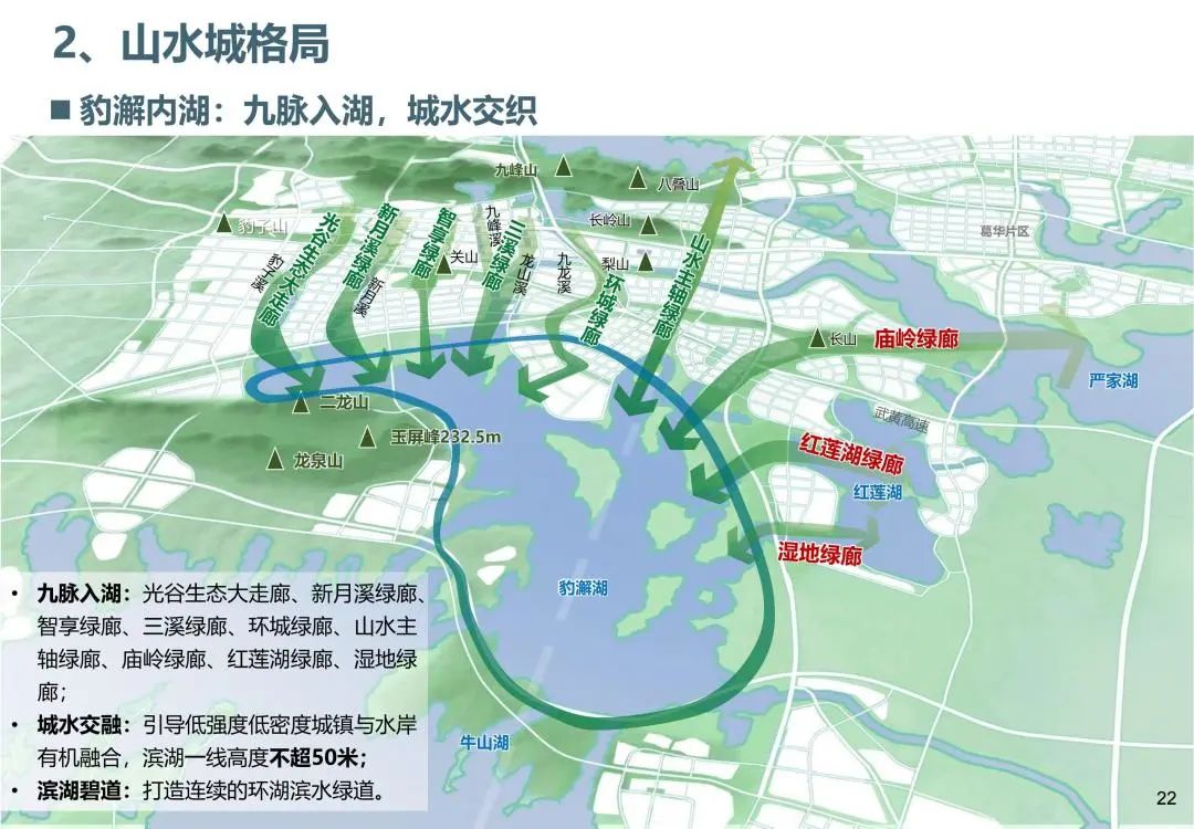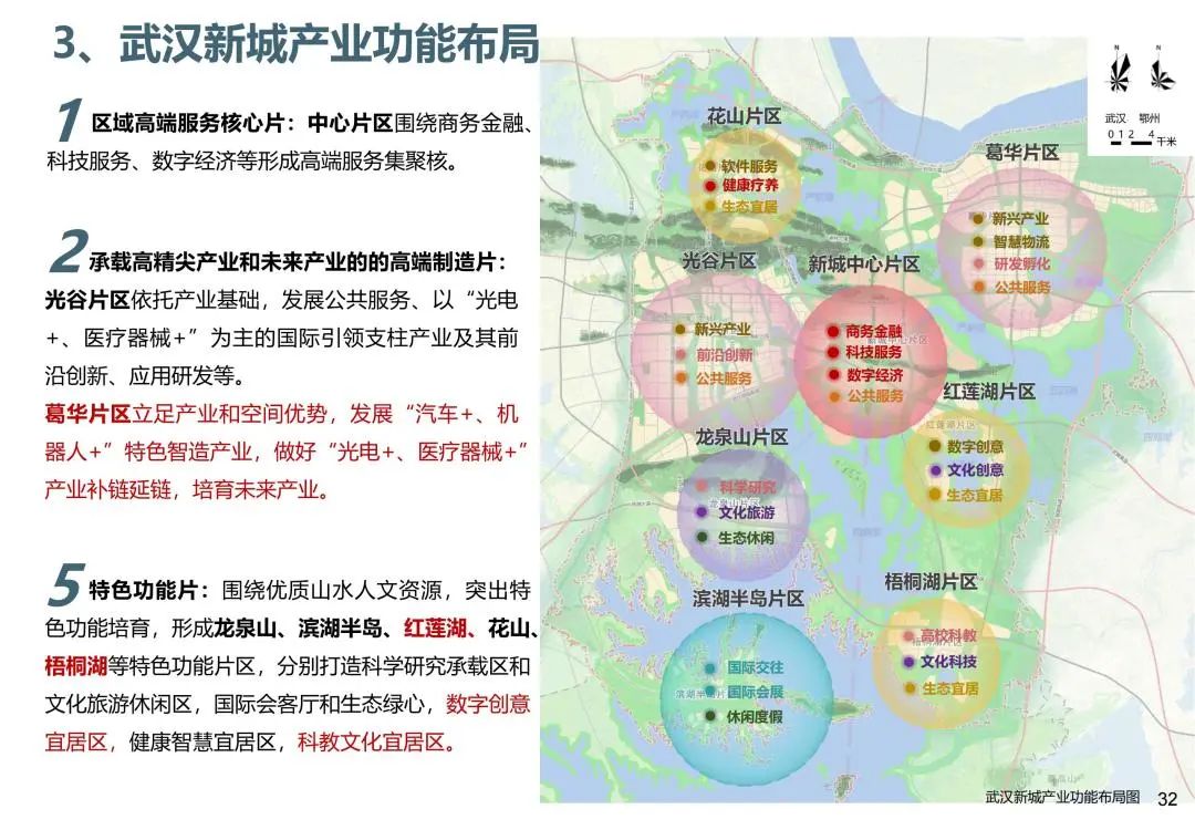 武汉新城十字山水主轴,五山九湖十九廊,“山湖相望、组团发展”, 葛华片区83平方公里(鄂州境内76平方公里),葛华片区人口规模50万人,其中鄂州45万人,可利用面积32平方公里。