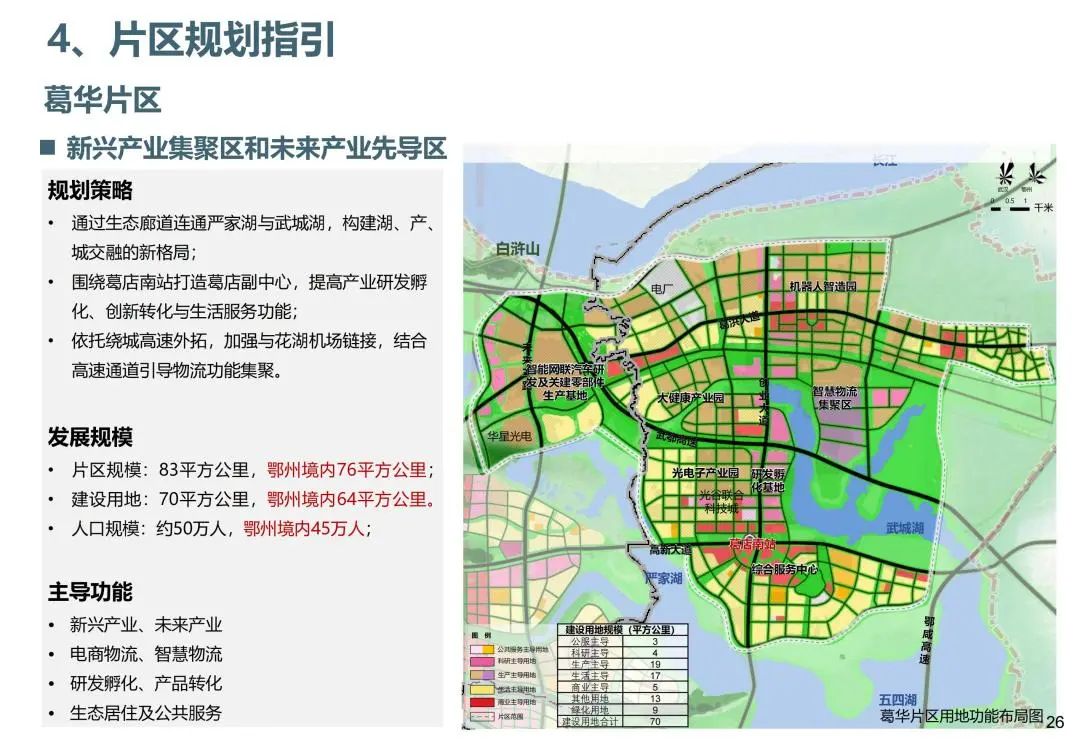 以打造新兴产业聚集区和未来产业先导区为定位,规划片区面积83平方公里,发展人口规模约50万人,并围绕葛店南站打造葛店副中心,提高产业研发孵化、创新转化与生活服务功能。