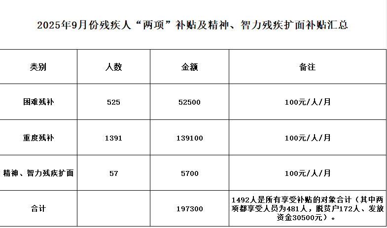 2025年9月份残疾人“两项”补贴及精神、智力残疾扩面补贴汇总