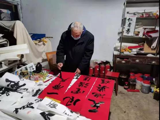 书法爱好者陈西州先生在家中工作室为群众书写对联