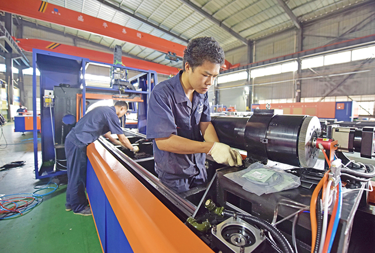 6月16日,在位于葛店经开区的武汉莱尔特激光科技有限公司厂房里,工人在调试设备。该公司主要经营激光、机械、机电领域内的技术开发、产品生产和销售,其研发的大幅面魔方激光切割设备采用光纤专用数控系统,配备切割工艺参数数据库,产品性能达到国际先进水平,目前已广泛应用于钢铁冶金、石化重工、船舶制造以及航空航天等重要领域。